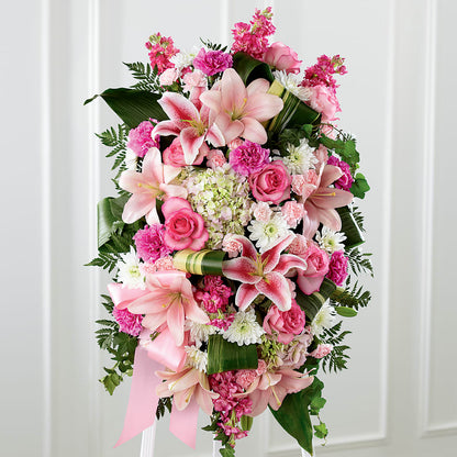 Our Comforting Standing Spray combines blushing blooms in a classic standing design to elegantly accent your messages of heartfelt sorrow. Crafted by our talented designers, this grand tribute is a beautiful array of hydrangea, lilies, stock, roses and more. It makes a stunning display at any memorial service for the passing of a loved one.